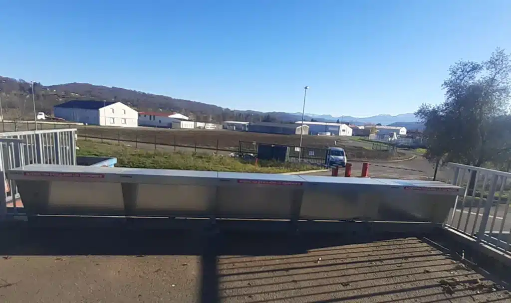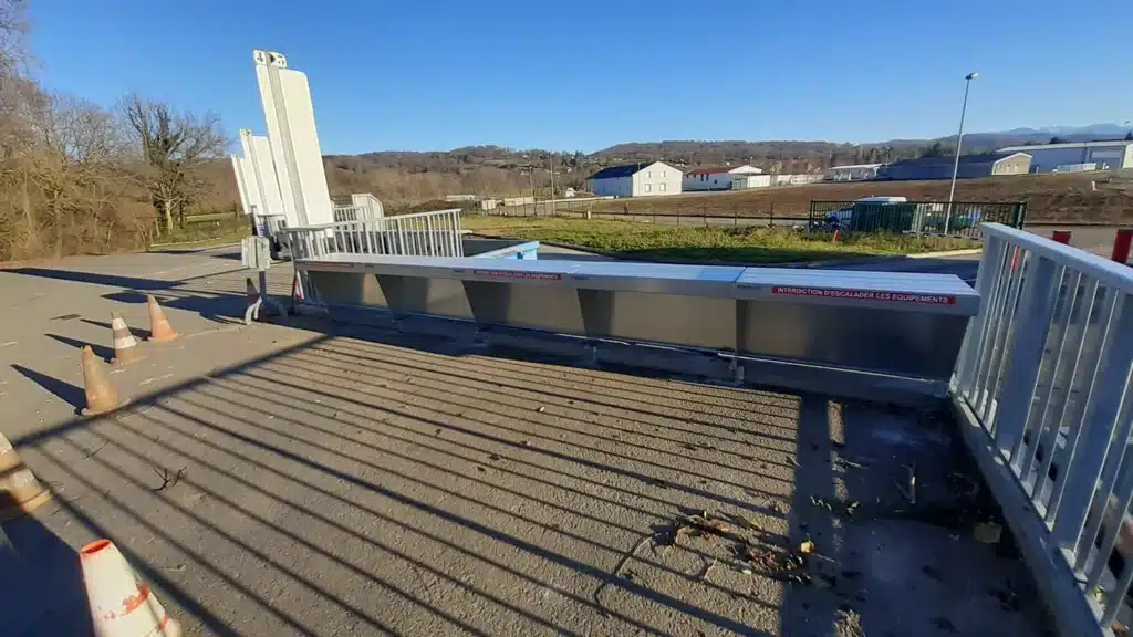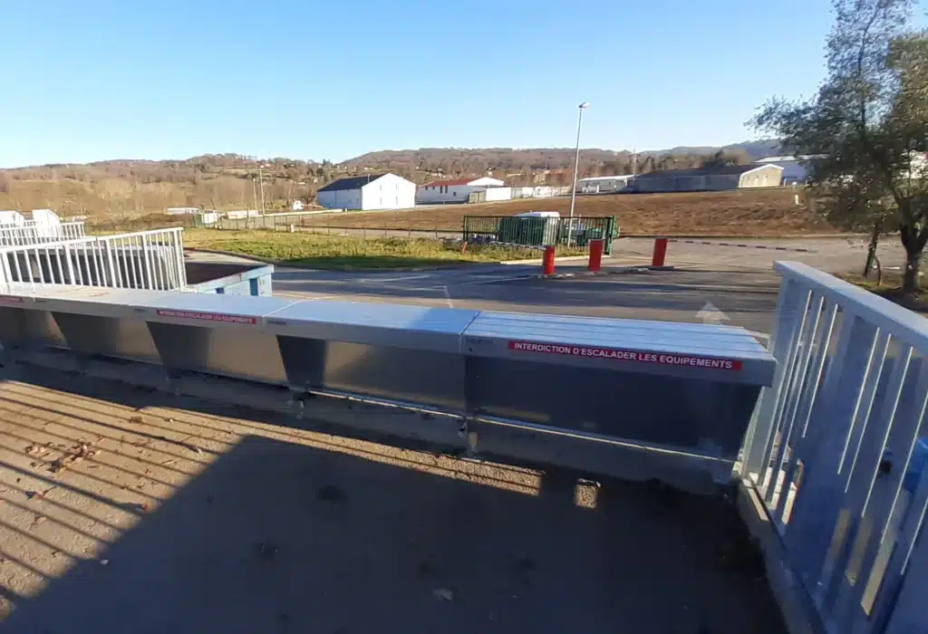 Dispositif de sécurité de haut de quai pour les déchetteries permettant le déchargement des déchets par les particuliers en toute facilité. Cette banque de déchargement SÉCO est fixe avec des bavettes en caoutchouc rétractables.