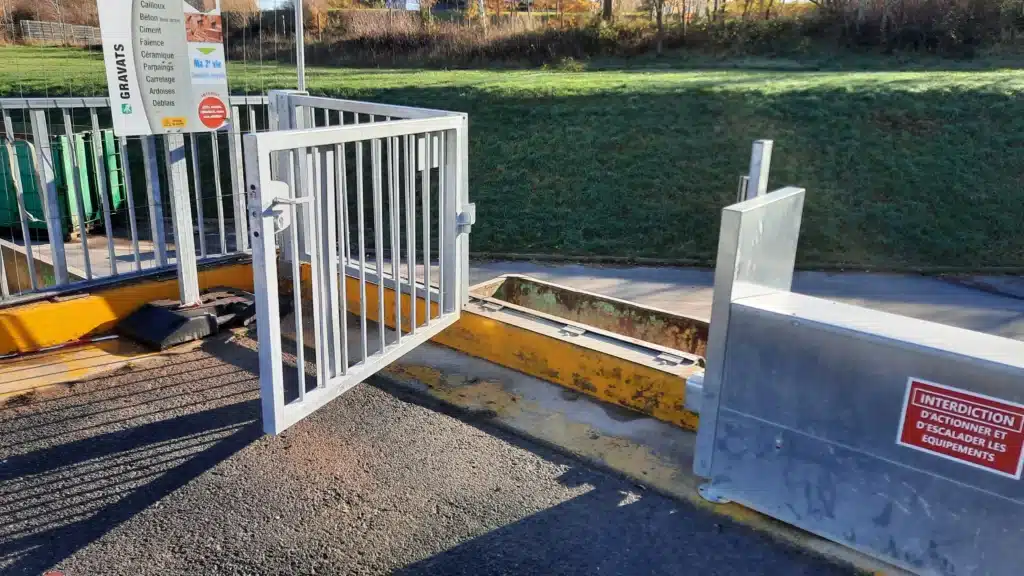 L’agent de la déchetterie, tout en étant protégé par le retour perpendiculaire, peut déverrouiller le mécanisme et ouvrir le garde-corps.